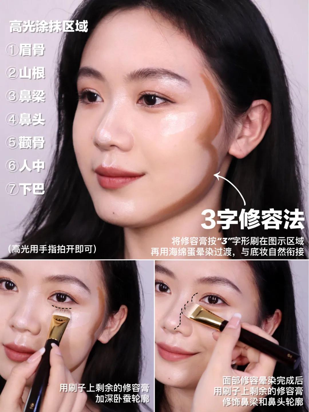 ②用修容刷蘸取阴影膏在脸周轮廓使用“3字修容法“,再用刷子上剩余的阴影膏加深卧蚕轮廓,弱化眼袋存在感,然后用美妆蛋将涂抹的阴影膏晕染过渡,和底妆自然融合。