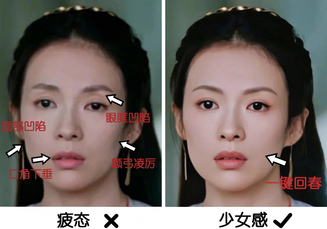 刚刚也说了,少女感流失最明显的感觉就是脸部凹陷明显,太阳穴凹陷、泪沟、法令纹上脸,都会导致脸部肌肤状态变垮。
